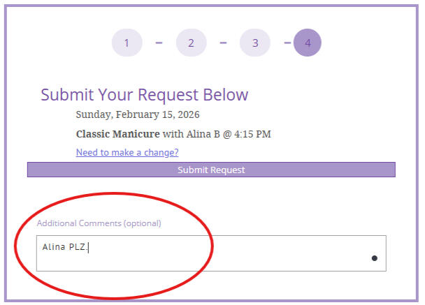 1. If you need to cancel or modify your appointment, please contact us by phone or email. The booking system will automatically apply a $25 no-show fee if the appointment is not canceled within the required time frame.2. If you request a specific technician or have any special requirements, please include the technician’s name and your requests in the “Additional Comments” section. This helps us ensure that your preferences are noted and handled properly, as shown in the example below: